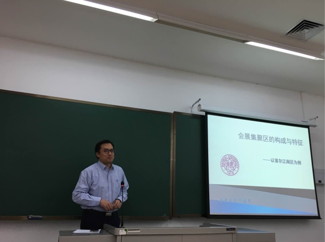 何会文老师以自己在韩国首尔的访员工活为背景,以首尔江南区为例,生动地讲述了会展集聚区的构成与特征。何老师首先结合具体事例解释了题目的由来并用数据化的形式展示了韩国会展经济的发展情况,并以此引出了会展集聚区的核心——韩国汉城世界贸易中心这一案例,结合这一具体案例以图文并茂的方式展现了会展集聚区外围应有的事物:酒店(旅馆)、购物、餐饮、旅游、娱乐以及交通,并介绍了会展集聚区的周边环境:设有大企业总部、高尔夫专卖店、湿地公园等。最后,何老师以会展集聚区的核心、配套旅游服务和设立区域为总结结束了本次分享。