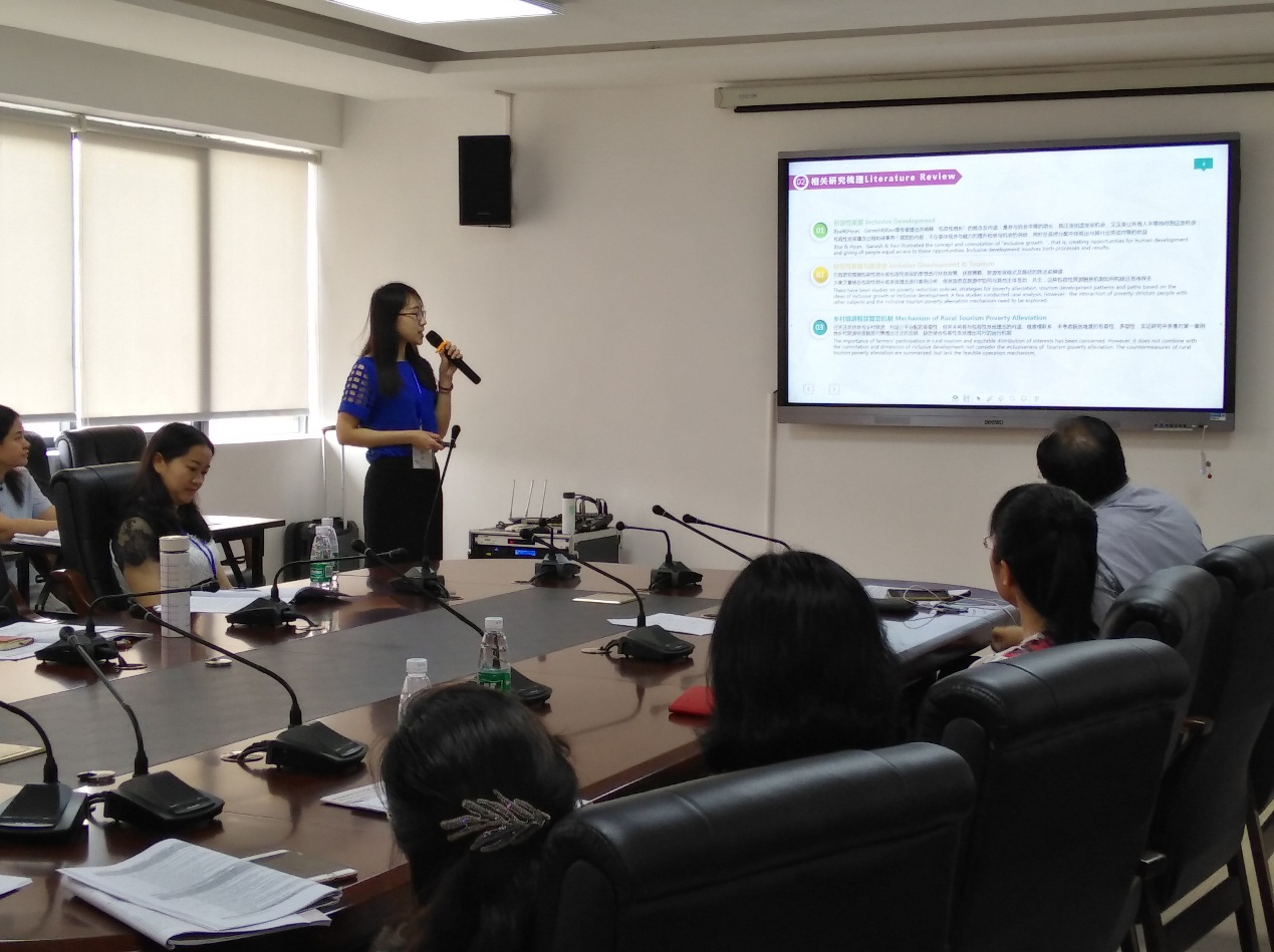研讨会的分会场共设六个学术分论坛以及两个研究生专场,包括了乡村旅游与城乡发展、乡村旅游与社会变迁、乡村旅游与旅游扶贫以及乡村振兴与乡村旅游等14个议题。博士生王彩彩进行了题为《包容性发展视域下乡村旅游脱贫致富机制研究》的分享汇报,就乡村旅游脱贫致富机制及其效果进行案例分析,构建政府引导下村民自治共享的包容性乡村旅游脱贫致富机制,并从经济、政治、环境、文化四方面分析脱贫致富机制的包容性发展成果。