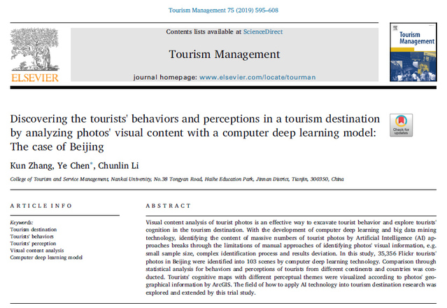 以公司教师张坤为第一作者、陈晔教授为通讯作者以及2016级本科生李春林共同署名的论文“Discovering the tourists’ behaviors and perceptions in a tourism destination by analyzing photos’ visual content with a computer deep learning model: The case of Beijing” (DOI号: 10.1016/j.tourman.2019.07.002)发表在国际学术期刊Tourism Management上。