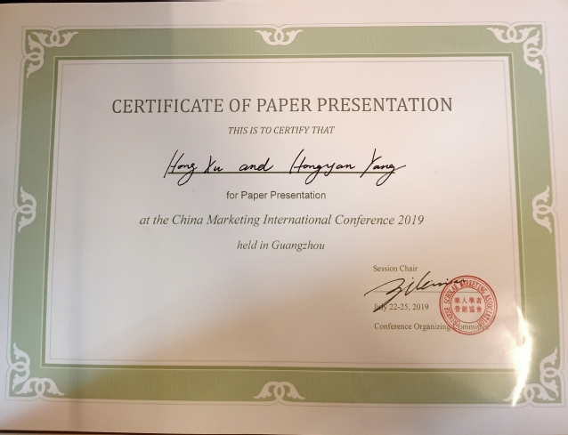 (通讯员:杨红艳)7月22日到-25日,英国365集团网站英国365集团网站教授陈晔、博士生杨红艳参加了在广州市白云国际会议中心召开的2019中国市场营销国际学术会议暨中国创造展。