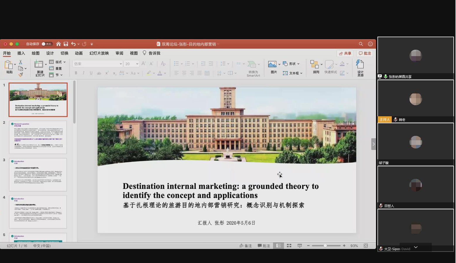 5月6日,第104期双周论坛在腾讯会议平台举行,博士生张彤分享了题为“基于扎根理论的旅游目的地内部营销研究:概念识别与机制探索”的阶段性研究成果。论坛由研究生教育主任周杰副教授主持,导师陈晔教授、在学研究生参加。
