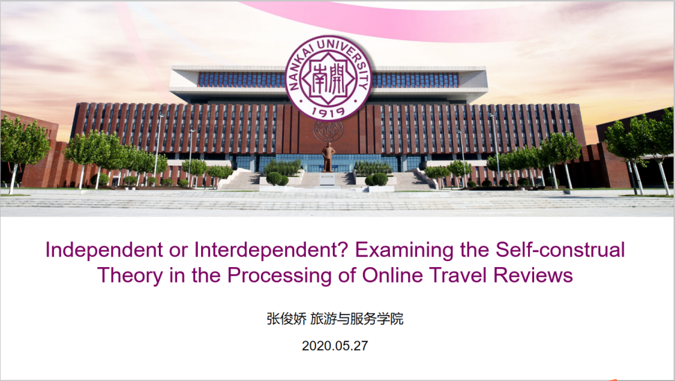 5月27日,第105期双周论坛在腾讯会议平台举行,博士后张俊娇分享了题为“独立VS依赖?自我建构对消费者处理在线旅游评论的影响”的研究成果。论坛由研究生教育主任周杰副教授主持,导师邱汉琴教授、在学研究生参加。