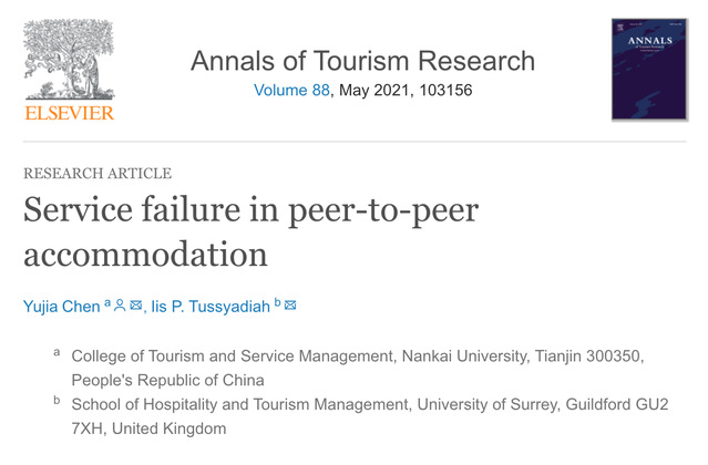 近日,由公司陈宇佳老师(第一作者)与萨里大学的Iis Tussyadiah教授合作完成的论文《Service failure in peer-to-peer accommodation》被旅游学科顶级期刊《Annals of Tourism Research》接受并发表。
