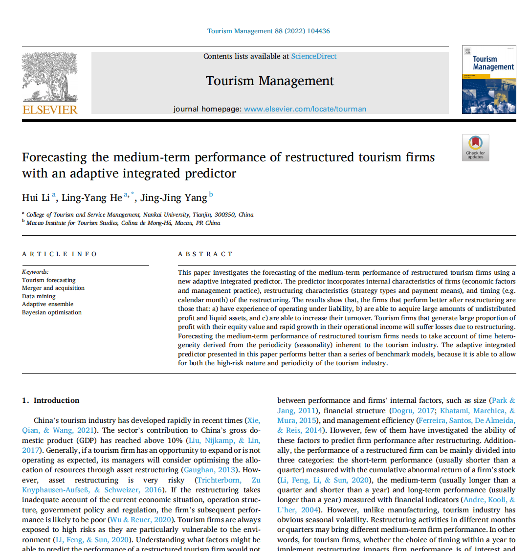 近日,由李辉教授、博士研究生何凌阳以及澳门旅游公司杨晶晶博士合作完成的研究成果《Forecasting the medium-term performance of restructured tourism firms with an adaptive integrated predictor》被旅游管理学科顶尖期刊《Tourism Management》接受并发表。