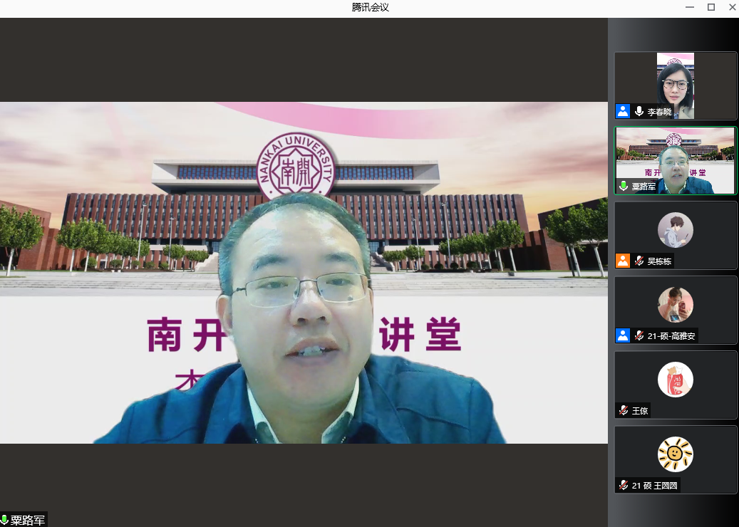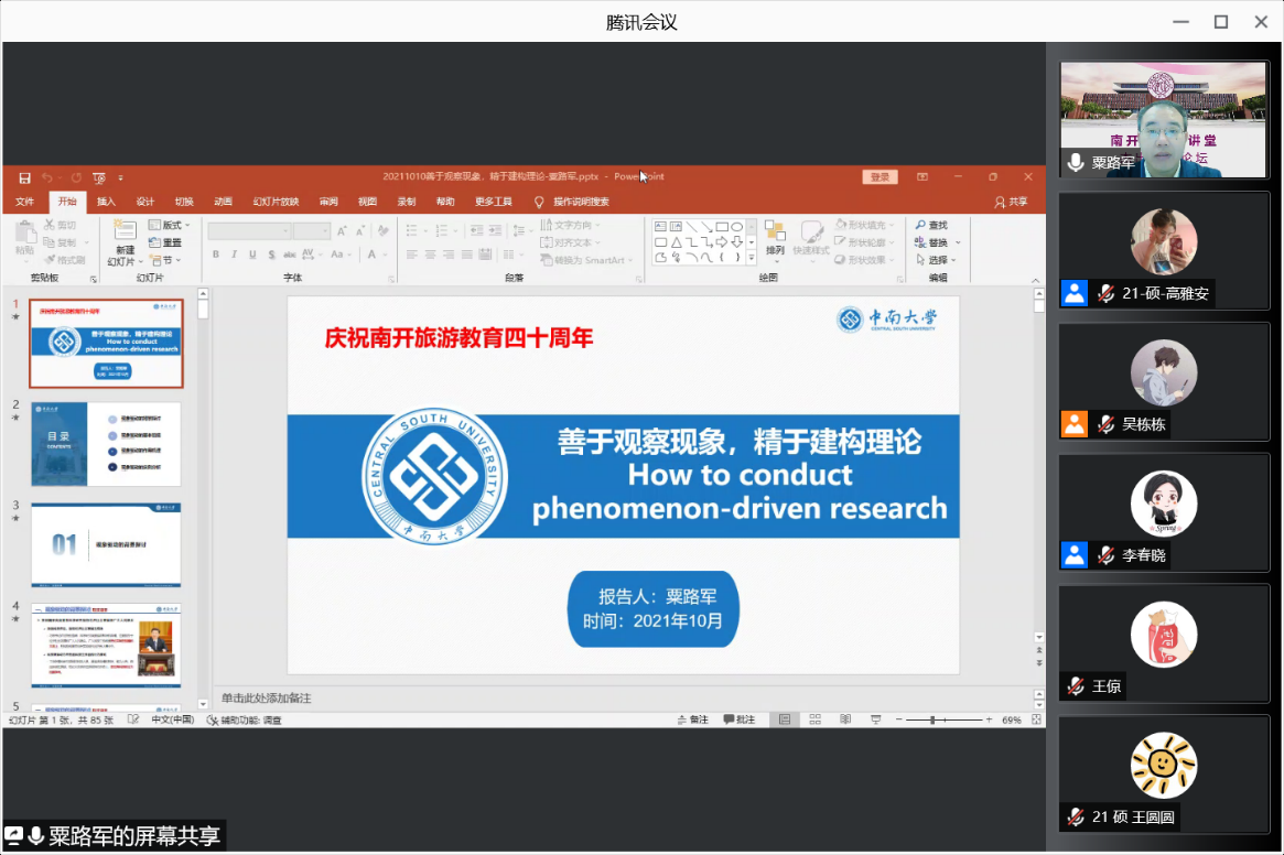 (通讯员:吴栋栋)10月14日下午,新学期的第一场南开“旅游大讲堂——杰出教授论坛”顺利开展。应公司邀请,中南大学商公司粟路军教授在腾讯会议平台为公司师生带来了“善于观察现象,精于建构理论”的精彩线上讲座。公司李春晓副教授、青年教师、博士后、硕博研究生等校内外研究成员共计200人左右参加了此次讲座,李春晓老师担任此次讲座的主持人。