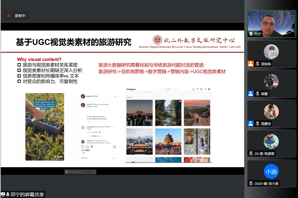 (通讯员:吴栋栋)10月22日下午,南开“旅游大讲堂——经理论坛”在腾讯会议平台顺利开展。应公司邀请,北京第二外国语公司旅游科学公司邓宁副经理为公司师生带来了“基于UGC视觉类素材挖掘的旅游数字化营销研究”的精彩线上讲座。公司青年教师、博士后和硕博研究生等校内外研究成员共计200余人参加了此次讲座,梁赛老师担任此次讲座的主持人。
