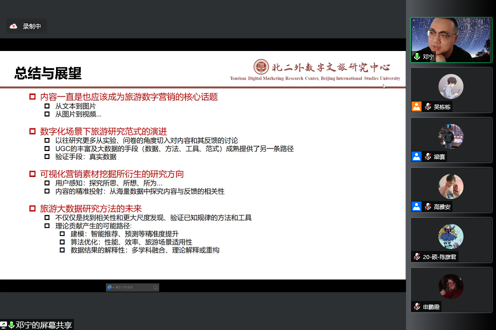 首先,邓宁老师指出旅游大数据研究需要找到与传统旅游问题对话的管道,即旅游研究—目的地营销—数字营销—营销内容—UGC视觉类素材。其次,从用户属性、图片内容解析、图片数字足迹等方面分析了视觉类素材与旅游研究的关系。接着,介绍了视觉类数据研究分支、信息提取、研究领域以及旅游图片的核心要素等等。最后,以团队的代表性研究成果为例对具体的研究思路、方法等内容进行讲解,同时对数字化场景下的旅游研究范式、可视化营销素材挖掘以及旅游大数据研究方法等方面研究进行总结和展望。