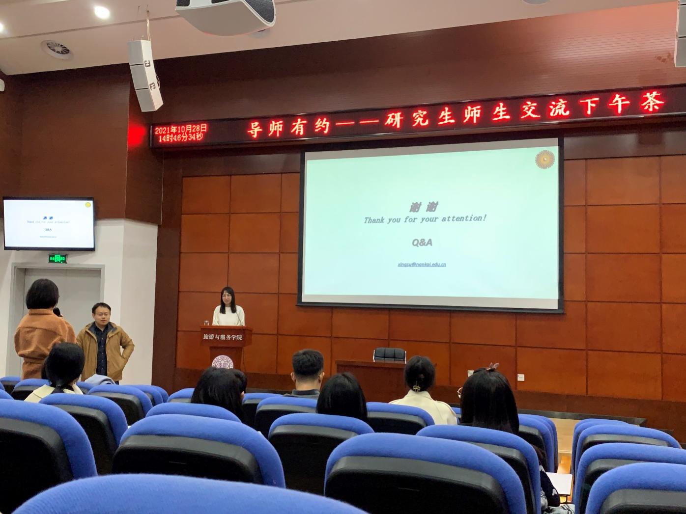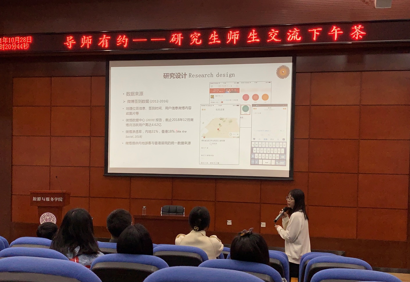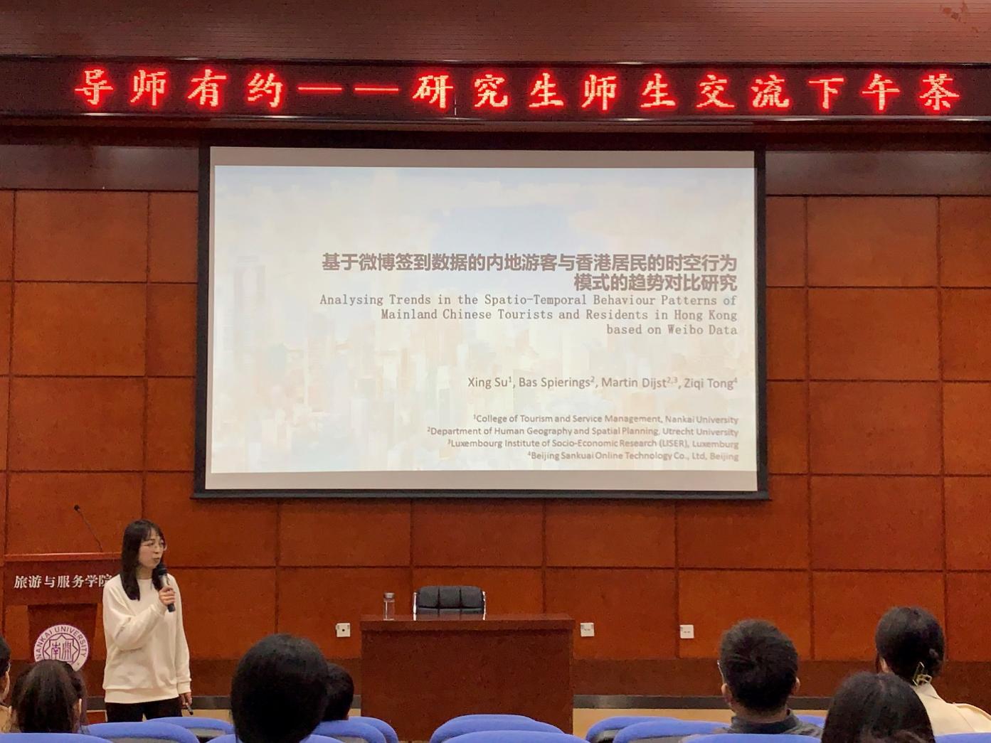 (通讯员:吴栋栋)10月28日下午,“导师有约——研究生师生交流下午茶”活动在公司135报告厅开展。作为旅游大讲堂系列活动之一,本次交流活动由英国365集团网站党委研究生工作部主办,英国365集团网站承办。苏醒博士以“基于微博签到数据的内地游客与香港居民的时空行为模式的趋势对比研究”为主题进行了研究分享。梁赛老师担任此次讲座的主持人,公司青年教师、硕博研究生参加了此次讲座。