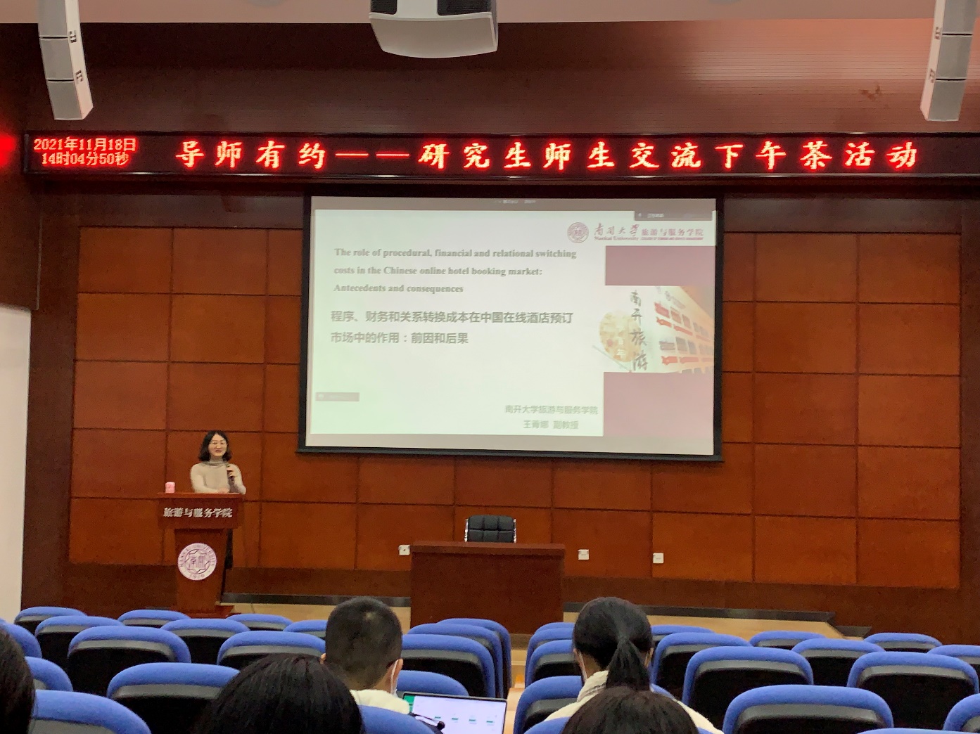 (通讯员:吴栋栋)11月18日下午,“导师有约——研究生师生交流下午茶”活动在公司135报告厅开展。作为旅游大讲堂系列活动之一,本次交流活动由英国365集团网站党委研究生工作部主办,英国365集团网站承办。王菁娜老师以“程序、财务和关系转换成本在中国在线酒店预订市场中的作用:前因和后果”为主题进行了研究分享。孙宁老师担任此次讲座的主持人,英国365集团网站副经理李辉教授、公司青年教师、硕博研究生参加了此次讲座。