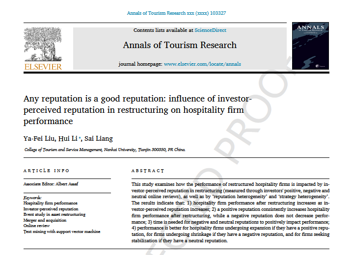 近日,由公司博士研究生刘亚斐、李辉教授和梁赛副教授合作完成的研究成果Any reputation is a good reputation: Influence of investor-perceived reputation in restructuring on hospitality firm performance被旅游管理一级学科顶尖期刊《Annals of Tourism Research》录用发表。该期刊是旅游管理学科的顶尖期刊,影响因子为9.011,是ABS 4星期刊和FMS旅游管理学科三本A类期刊之一,在旅游管理领域中极具影响力。该文章以旅游企业资产重组绩效为关注点,综合运用事件研究法和网络文本数据挖掘法,识别出了影响旅游企业重组绩效的新型元素——旅游投资者感知声誉。旅游投资者在线评论行为反映了其对旅游重组事件的态度和对重组旅游企业未来发展的预期。重组期间产生的大量投资者在线评论行为蕴含着旅游企业资产重组事件被旅游投资者群体感知到的战略声誉情况。该文章以旅游投资者在线评论信息代理旅游投资者针对旅游企业重组事件的感知声誉,利用文本挖掘技术将旅游投资者感知声誉区分为积极声誉、中立声誉和消极声誉。研究发现:1)旅游投资者感知声誉对旅游企业资产重组绩效有正向影响作用,无论这一声誉是正面、负面还是中立的,其对企业绩效的影响作用都是积极的;2)积极的感知声誉对旅游企业扩张战略(资产收购)的正向影响最强,负面的感知声誉对旅游企业收缩战略(资产剥离)的正向影响最强,中立的感知声誉对旅游企业稳定性战略(股权转让)的正向影响最强;3)积极的感知声誉对旅游企业资产重组绩效的正向影响是即时的,中立和消极的感知声誉的影响产生则存在时间滞后性。该研究发现了旅游企业资产重组绩效新的影响因素,创新性的将旅游企业声誉管理的客体由旅游产品消费者转向旅游业务投资者,为旅游企业有效开展利益相关者管理提供了理论依据。