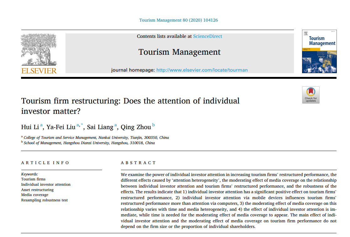 据悉,这是博士研究生刘亚斐同学完成的有关旅游企业资产重组绩效的科研成果第二次刊发在旅游管理国际顶尖期刊上。此前,由李辉教授、博士研究生刘亚斐、梁赛副教授等人与合作者共同完成的研究成果Tourism firm restructuring: Does the attention of individual investor matter? 被旅游管理一级学科顶尖期刊《Tourism Management》录用并发表。该期刊的影响因子为10.967,在所有管理类期刊中名列前5%,是旅游管理学科国际三大顶尖期刊之一和FMS旅游管理学科三本A类期刊之一;在旅游管理类期刊中具有权威性,拥有极高的学术影响力和学术声誉。该文章同样聚焦于旅游企业资产重组绩效问题,运用事件研究法来探索旅游企业资产重组过程中,个体投资者关注度对旅游重组绩效的影响机制。研究中使用旅游重组业务相关的百度搜索指数来代理旅游投资者关注情况。研究发现:1)旅游投资者关注度正向影响旅游企业重组绩效;2)旅游投资者移动端关注度对旅游企业重组绩效的正向影响程度高于旅游投资者电脑端关注度的影响;3)新闻媒体报道对旅游投资者关注度与旅游企业重组绩效的关系有调节作用。