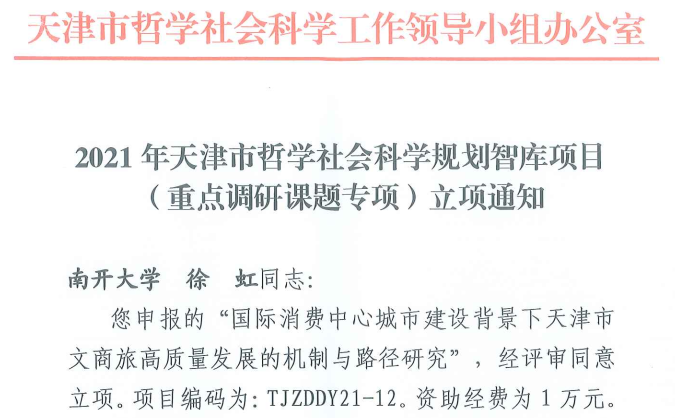 近日,2021年度天津市哲学社会科学规划智库项目(重点调研课题专项)发布立项通知,公司徐虹老师申报的《国际消费中心城市建设背景下天津市文商旅高质量发展的机制与路径研究》获得课题立项。