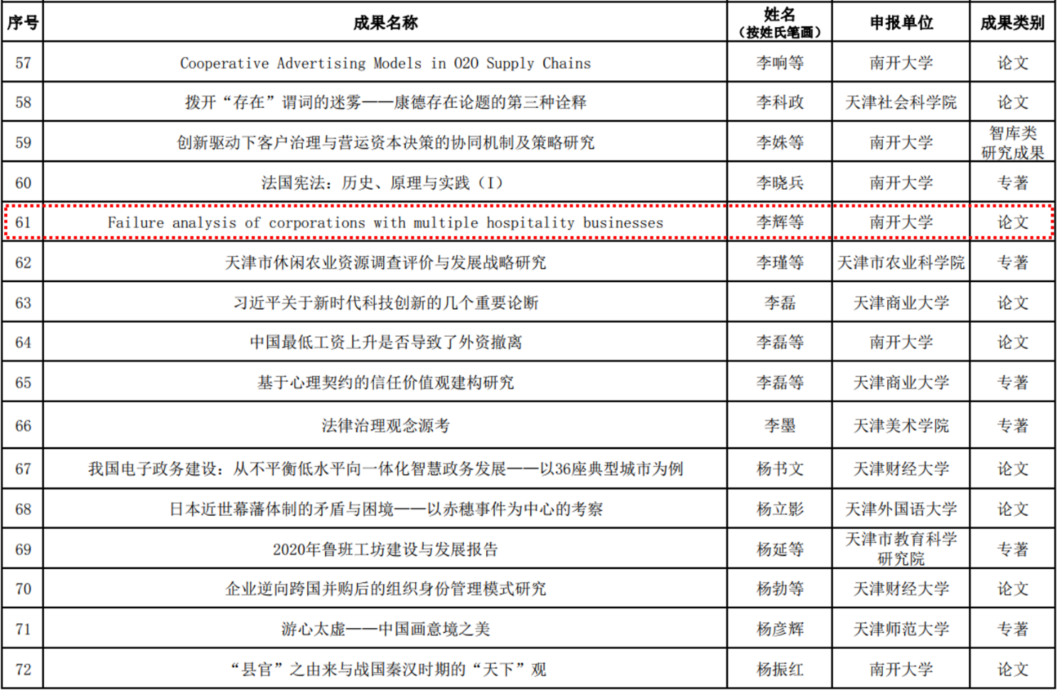 近日,第十七届天津市社会科学优秀成果奖评选结果正式公示,公司李辉教授和合作者完成的研究成果《Failure analysis of corporations with multiple hospitality businesses》获得第十七届天津市社会科学优秀成果奖三等奖。