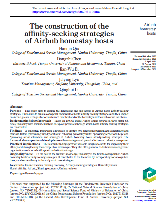 近日,由公司邱汉琴教授与合作者共同完成的学术成果《The construction of the affinity-seeking strategies of Airbnb homestay hosts》被旅游管理一级学科顶尖期刊《International Journal of Contemporary Hospitality Management》接受并发表。