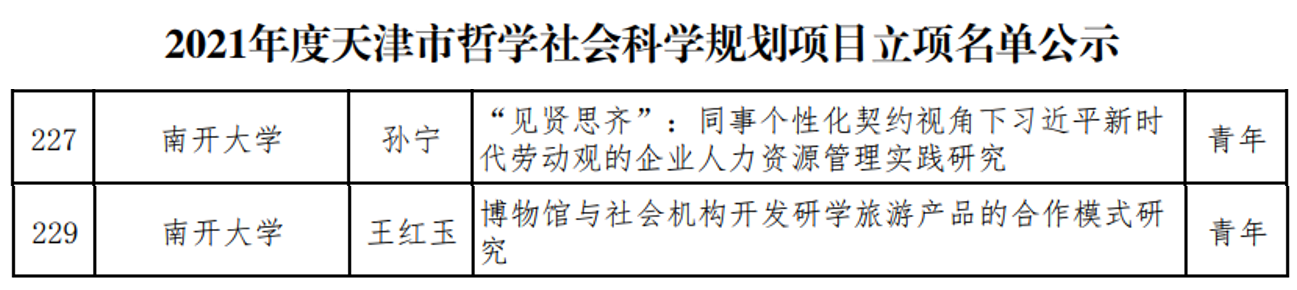 近日,2021年度天津市哲学社会科学规划项目立项名单正式公示,公司孙宁老师申报的课题《“见贤思齐”:同事个性化契约视角下习近平新时代劳动观的企业人力资源管理实践研究》和王红玉老师申报的课题《博物馆与社会机构开发研学旅游产品的合作模式研究》获得2021年度天津市哲学社会科学规划青年项目立项。