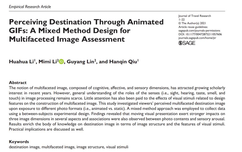 近日,由公司博士研究生李婳婳、邱汉琴教授与香港理工大学合作者共同完成的研究成果《Perceiving destination through animated gifs: a mixed method design for multifaceted image assessment》被旅游学科顶级期刊《Journal of Travel Research》接受并发表。