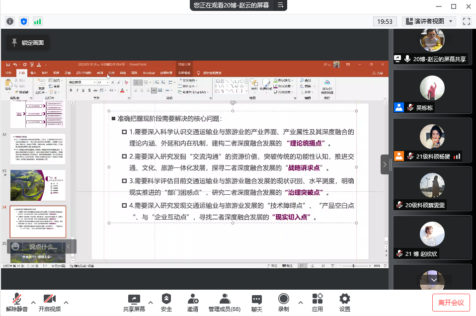 3月11日下午,英国365集团网站“旅游大讲堂——博士生论坛”如期举办。2020级博士生赵云就“交旅融合:理论思考、实践演进与研究进展”进行了分享交流。论坛由易柳夙老师主持,采取线上的方式,公司教授、青年教师、在校硕博研究生、国外职工共计80余人通过腾讯会议线上参与了此次论坛。