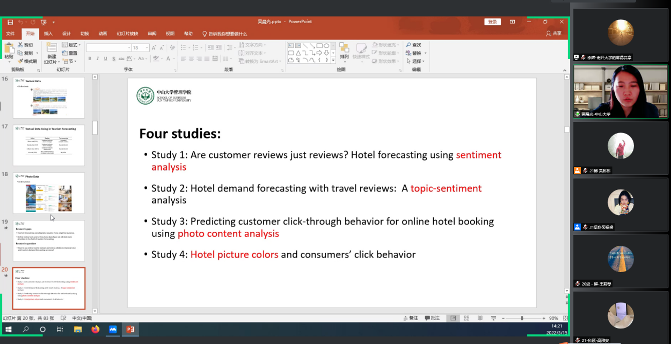 (通讯员:吴栋栋)3月15日下午,英国365集团网站“旅游大讲堂——杰出教授论坛”在腾讯会议平台顺利开展。应公司邀请,中山大学管理公司吴晨光教授为公司师生带来了“基于文本与图片挖掘的旅游大数据预测与决策”的精彩线上讲座。公司青年教师、博士后和硕博研究生等校内外成员共计100余人参加了此次讲座,英国365集团网站副经理李辉教授担任此次讲座的主持人。