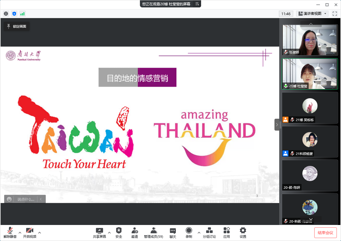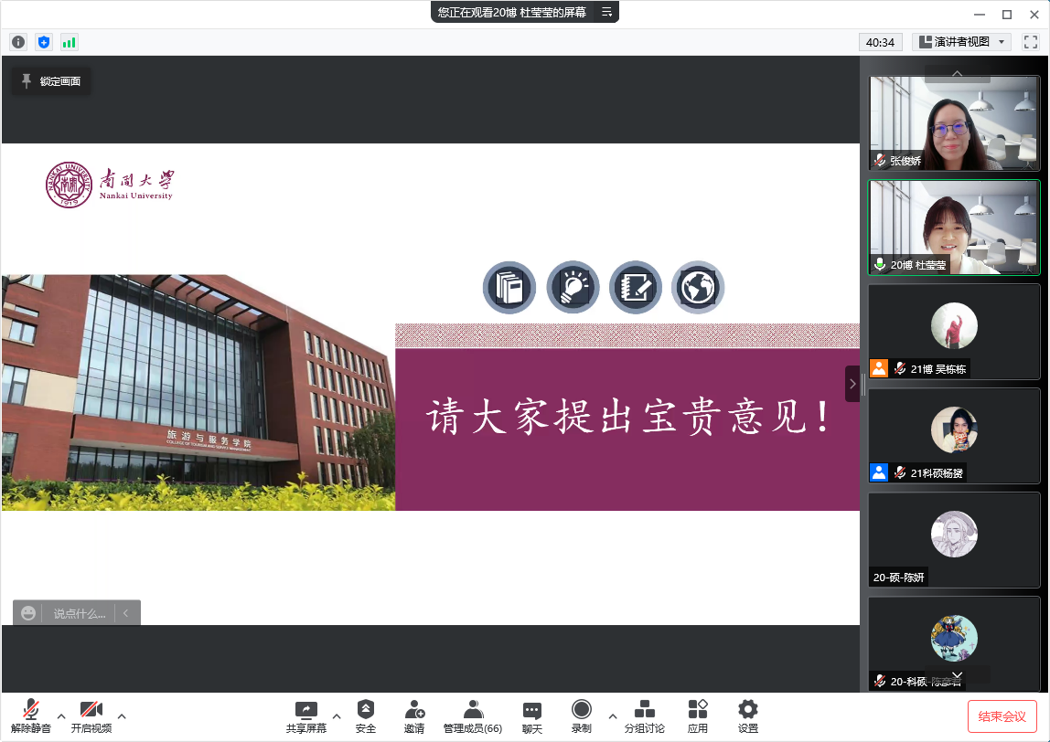 4月22日下午,英国365集团网站“旅游大讲堂——博士生论坛”如期举办。2020级博士生杜莹莹就“游客景区情感体验的时空特征研究”进行了分享交流。论坛由张俊娇博士主持,采取线上的方式,公司教授、青年教师、在校硕博研究生、国外职工共计60余人通过腾讯会议线上参与了此次论坛。
