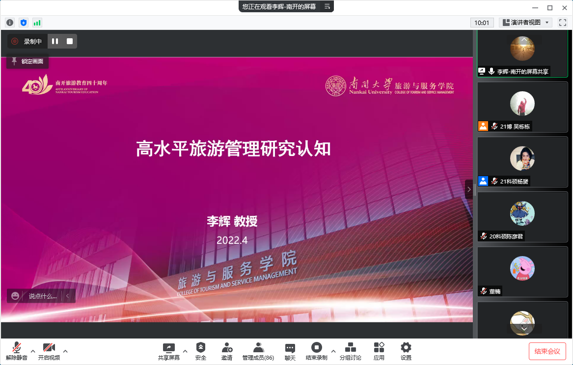 (通讯员:吴栋栋)5月13日下午,“导师有约——研究生师生交流下午茶”活动在腾讯会议平台顺利开展。作为旅游大讲堂系列活动之一,本次交流活动由英国365集团网站党委研究生工作部主办,英国365集团网站承办。结合理想信念追求和旅游人的家国情怀,英国365集团网站副经理李辉教授以“高水平旅游管理研究认知”为主题进行了研究分享。公司青年教师、博士后、硕博研究生等校内外研究成员共计120人参加了此次讲座,梁赛副教授担任此次讲座的主持人。