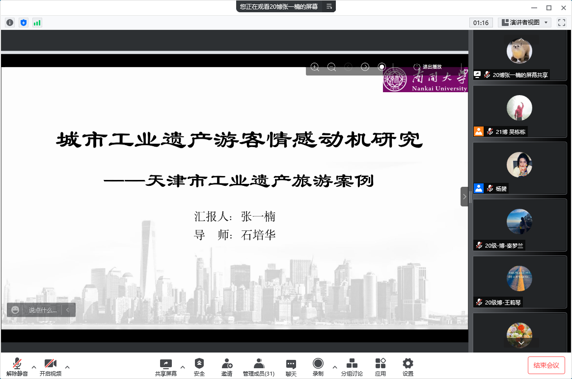 张一楠同学从工业遗产旅游问题的提出、理论综述、研究方案、结果及讨论和研究结论五个方面进行了汇报。研究首先构建并验证了工业遗产旅游的游客情感动机测量模型,并以天津市工业遗产为例,通过问卷调查与半结构性访谈等方式,从利己主义情感动机和利他主义情感动机2个维度及其细分的10个问项,对案例地游客的情感动机进行了量化评估。