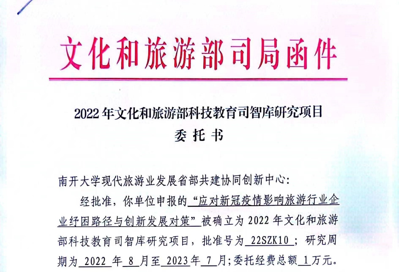 (通讯员:王屹君)近日,公司石培华教授依托现代旅游业发展省部共建协同创新中心申报的2022年度文化和旅游部科技教育司智库研究项目《应对新冠疫情影响旅游行业企业纾困路径与创新发展对策》获批立项(项目编号:22SZK10),研究周期为一年。项目组主要成员包括公司陈晔教授、杨德进副教授、妥艳媜副教授,以及协同创新中心副主任李中副研究员等。