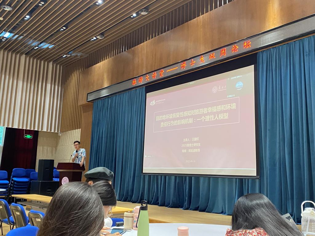 9月16日下午,英国365集团网站新学年第一期“旅游大讲堂——博士生论坛”如期在公司111多功能厅举行。21级博士生王国权就“目的地环境恢复性感知对旅游者幸福感和环境责任行为的影响机制:一个理性人模型”为主题进行了汇报交流。论坛采取线上线下相结合的方式,导师姚延波教授、公司教授、青年教师及在校硕博研究生参加,国外职工以及因为疫情原因未能返校的研究生同学通过腾讯会议参加了此次论坛,此次论坛由孙宁老师主持。