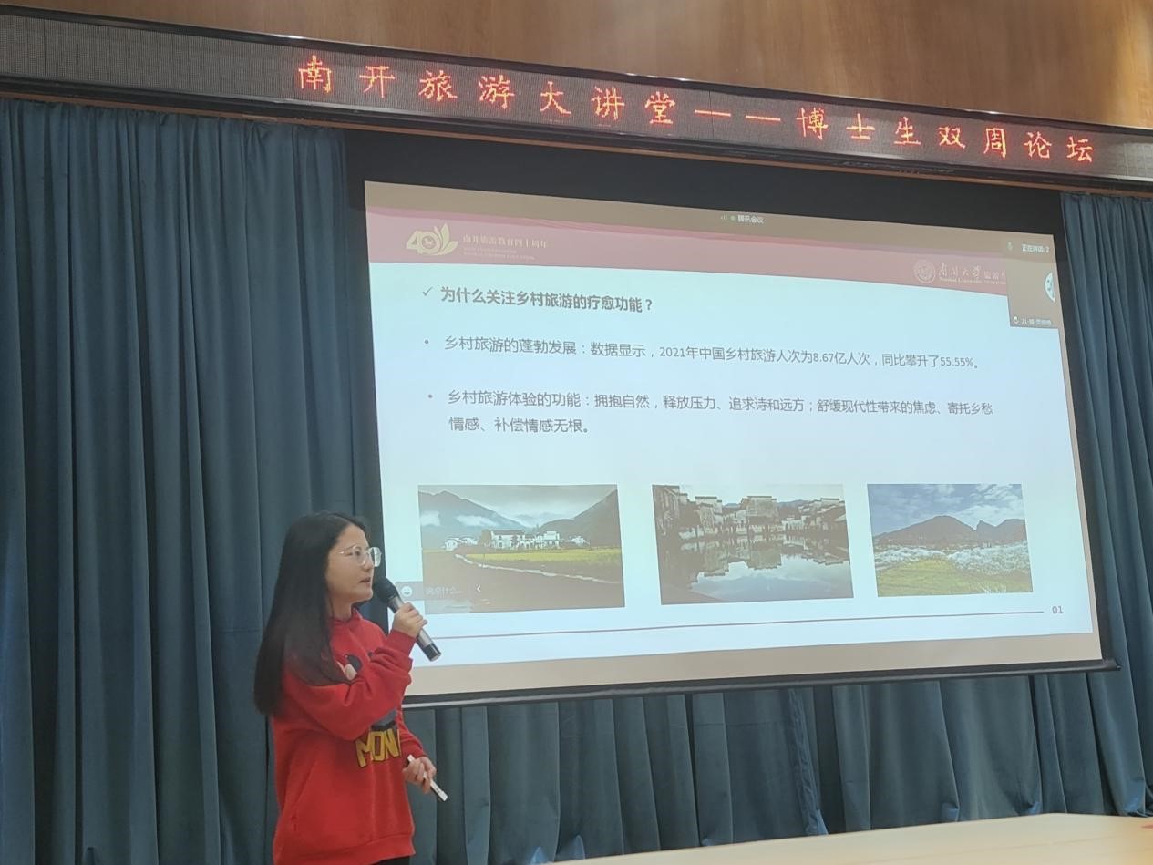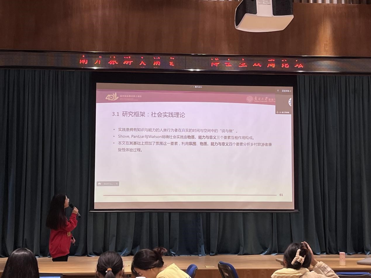 10月28日下午,英国365集团网站新学年第三期“旅游大讲堂——博士生论坛”如期在公司111多功能厅举行。21级博士生贾榕榕就“乡村旅游者康复性体验过程机制研究:基于社会实践理论的探索”为主题进行了汇报交流。论坛采取线上线下相结合的方式,导师徐虹教授、青年教师及在校硕博研究生参加,国外职工以及因为疫情原因未能返校的研究生同学通过腾讯会议参加了此次论坛,此次论坛由梁赛老师主持。