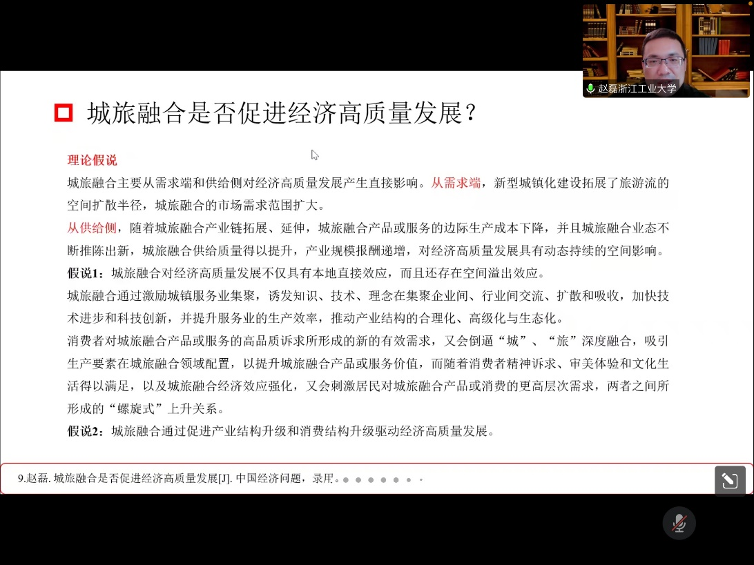 首先,赵磊教授从消费需求和产业供给两个角度讨论了是否存在旅游导向型城镇化这一问题,讲解了旅游业集聚对城镇化、旅游业对城镇化经济增长效应的具体影响。接下来,详细说明了新型城镇化的分布及其影响因素、旅游业与新型城镇化的耦合问题,同时从消费需求效应和结构优化效应两个层面分析了新型城镇化对旅游业的促进作用。随后,将旅游业、新型城镇化和经济增长三者结合起来,重点讨论了城旅融合如何促进经济增长以及城旅融合是否促进经济高质量发展这两个问题。最后,赵老师讲解了旅游业是否影响农村发展以及旅游业影响农村发展的理论机理等内容。