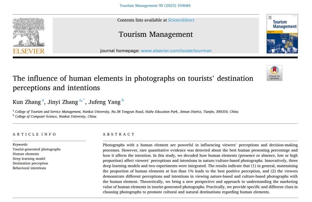 近日,由公司张坤副教授、硕士生张津沂及合作者共同完成的研究成果《The influence of human elements in photographs on tourists' destination perceptions and intentions》被旅游管理科学国际三大顶尖期刊之一的《Tourism Management》接受并发表。