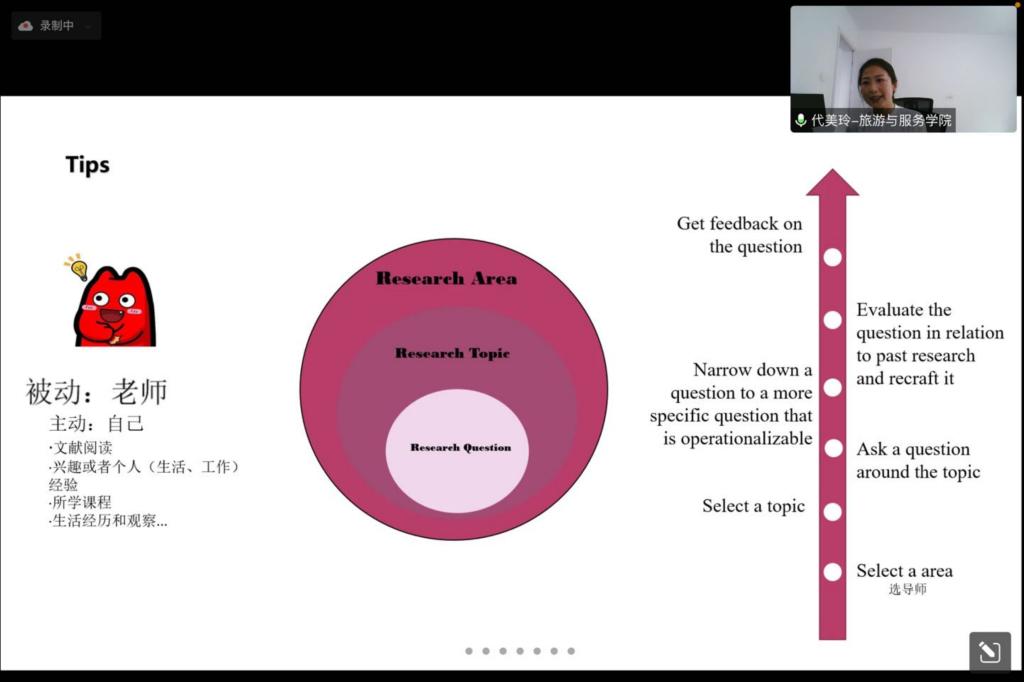 (通讯员:熊流芳)11月8日下午,“导师有约——研究生师生交流下午茶”活动在腾讯会议平台顺利开展。作为旅游大讲堂系列活动之一,本次交流活动由英国365集团网站党委研究生工作部主办,英国365集团网站承办。代美玲博士以“科研是场拉锯战:身心均需经淬炼”为主题进行了研究分享。公司青年教师、博士后、硕博研究生等校内研究成员共计105人参加了此次讲座,毕建武副教授担任此次讲座的主持人。