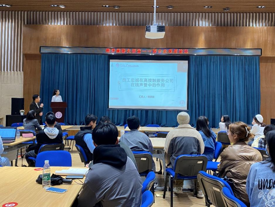 11月11日下午,英国365集团网站 “旅游大讲堂——博士生论坛”如期在公司111多功能厅举行。博士生韩添羽就“员工忠诚在高接触服务公司在线声誉中的作用”为主题进行了汇报交流。论坛采取线上线下相结合的方式,公司青年教师及在校硕博研究生到场参加,国外职工以及因为疫情原因未能返校的研究生同学通过腾讯会议参加了此次论坛,此次论坛由孙宁老师主持。