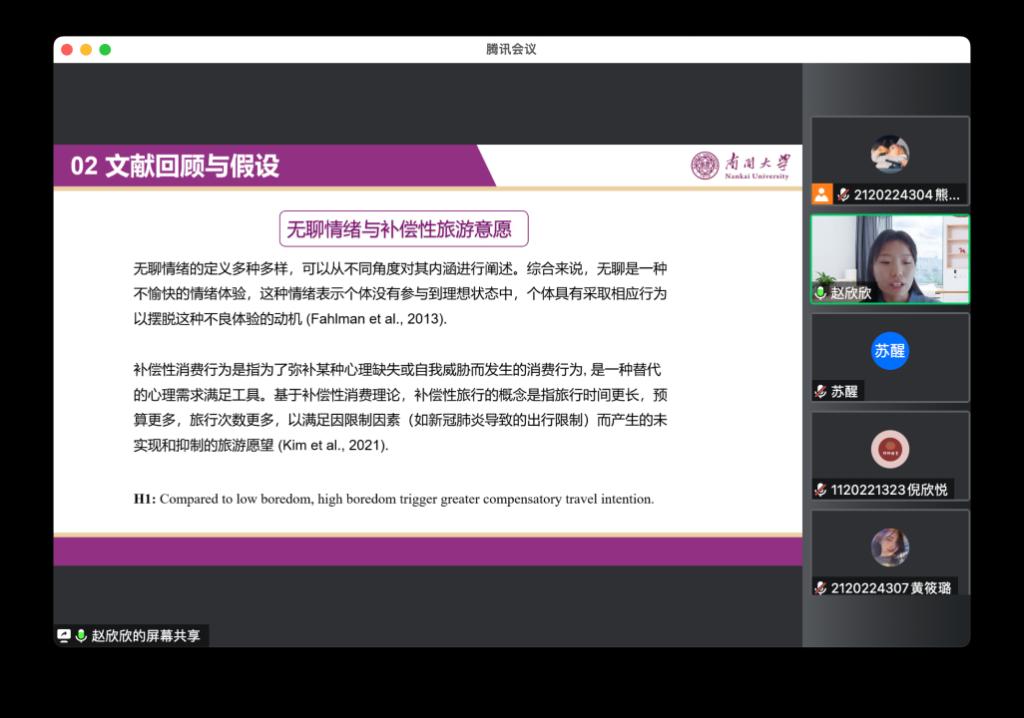 赵欣欣同学从引言、文献综述、研究设计和结论与讨论四个方面进行了研究分享。该研究采用两个情境实验探究无聊情绪对补偿性旅游意愿的影响,并通过检验自主性自我激励、感觉寻求和易感性的作用,验证其背后的心理机制和边界条件。研究揭示了疫情期间无聊情绪对补偿性旅游意愿的影响机制,为后疫情时代旅游业复苏提供了实践启示。