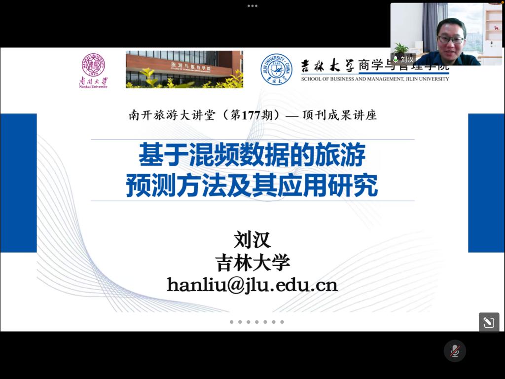 (通讯员:熊流芳)12月16日下午,“南开旅游大讲堂(第177期)——顶刊成果讲座”以在线的形式顺利开展,就旅游经济研究展开讨论。应公司邀请,吉林大学商学与管理公司和数量经济研究中心刘汉教授为公司师生带来了“基于混频数据的旅游预测方法及其应用研究”的精彩讲座。公司经理、教授、青年教师、博士后和硕博研究生等校内外人员共计110余人参加了此次讲座,李辉教授担任此次讲座的主持人。