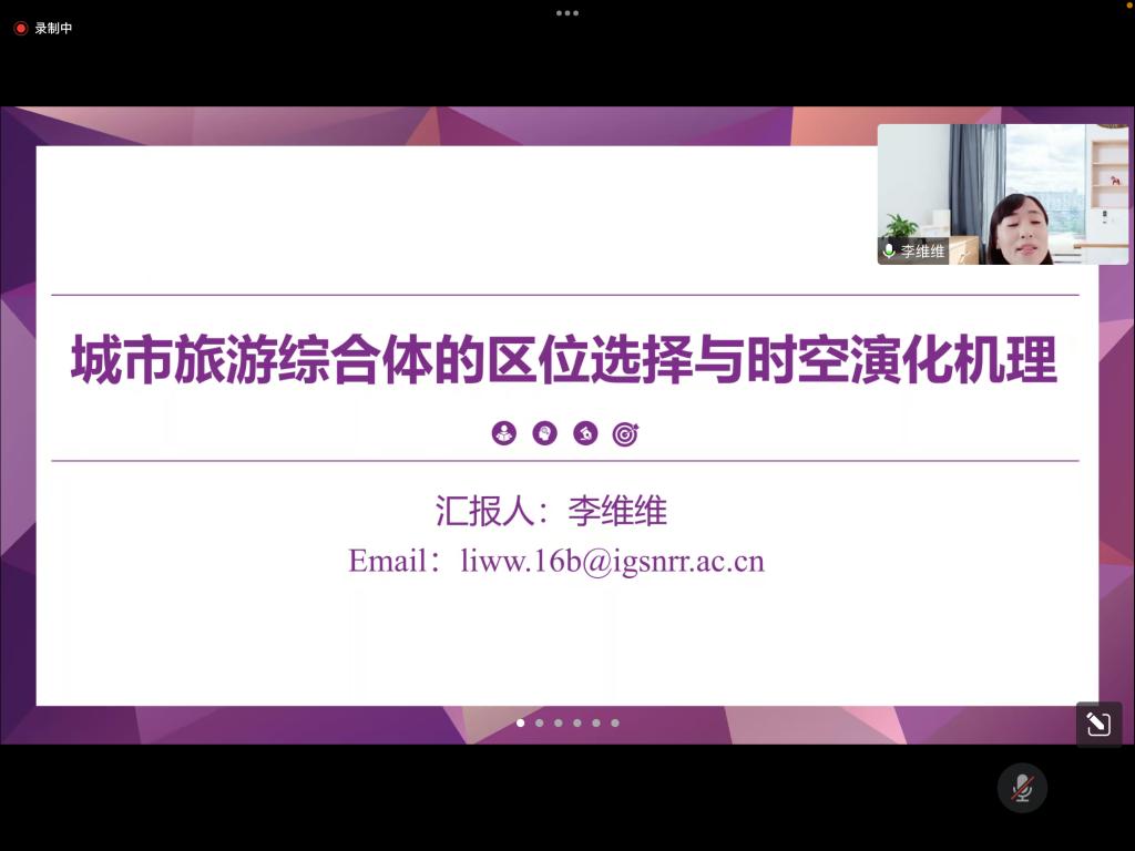 李维维老师以“城市旅游综合体的区位选择与时空演化机理”为主题进行了报告。首先,她分析了城市旅游综合体的缘起和发展,对杭州及西溪湿地这两个典型的案例地进行了简单介绍。然后,李老师从地理空间分析方法和土地利用变化指数模型两个角度展示了她的研究方法,说明了城市旅游综合体的区位选择和时空演化这两项研究的具体数据来源。最后,李老师从城市旅游综合体的区位分布格局演变特征、区位选择成因、土地利用时空演化特征、过程及机制等多个方面总结了她的研究结论。
