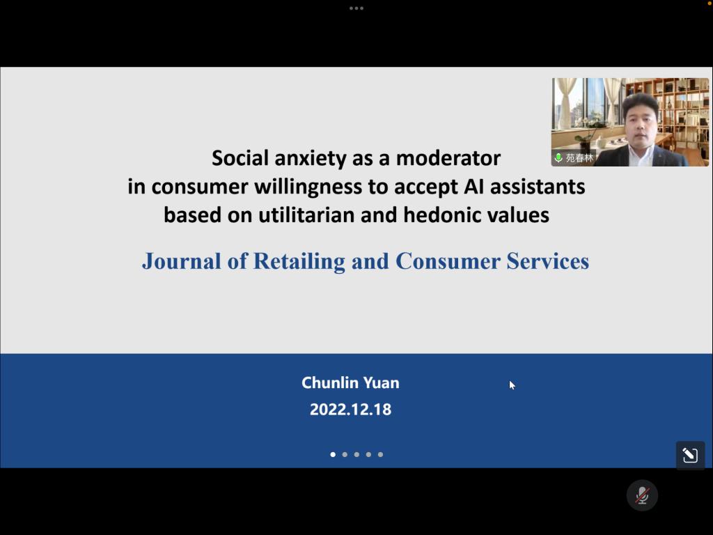 苑春林老师以“从实用价值和享乐价值层面探索用户对Al助手的接受意愿:社交焦虑的调节作用”为主题进行了报告。首先,苑老师从人工智能助手的优势及应用、用户的感知价值和接受意愿、双系统理论以及社交焦虑四个方面对研究现状和过往文献进行了分析与回顾。然后,苑老师从准确性、响应性、兼容性、拟人性、亲和力五个维度探究AI助手对实用价值及感知价值的影响,并介绍了他的研究假设与理论模型。接下来,他分享了收集研究样本、设计调查问卷、检验和分析数据的具体操作过程。最后,苑老师从理论研究与营销启示两个方面对其研究贡献进行总结并提出了研究展望。