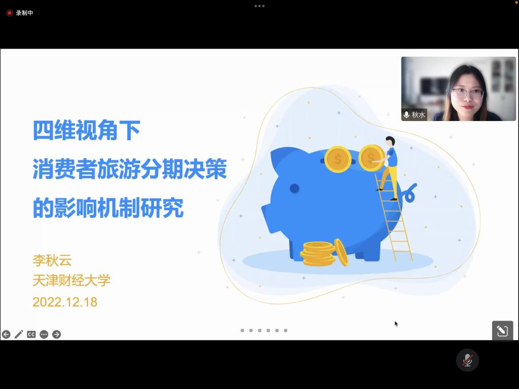 李秋云老师以“四维视角下消费者旅游分期决策的影响机制研究”为主题进行了报告。首先,李老师对消费信贷和消费金融的概念、消费金融场景的多元化、旅游消费信贷业务的发展等内容进行了简单介绍。接着,她从购买类型、旅游动机和文化差异三个角度对旅游消费信贷的相关研究展开了文献述评。最后,李老师从个人特质、交易框架、旅游动机和文化背景四个维度构建了旅游分期决策的分析框架,详细说明了本研究所采用的研究方法,包括情境实验法、内隐联想测试、眼动追踪技术等内容。