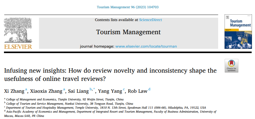 近日,公司梁赛副教授作为通讯作者与合作者完成的研究成果《Infusing new insights: How do review novelty and inconsistency shape the usefulness of online travel reviews?》被旅游管理学科国际三大顶尖期刊之一的《Tourism Management》接收并发表。