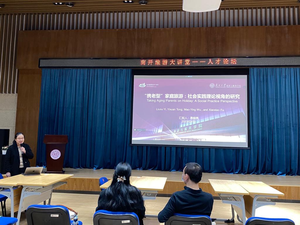 易柳夙老师以“‘携老型’家庭旅游:社会实践理论视角的研究”为主题进行了报告。首先,易老师对“携老型”家庭旅游活动的研究现状、代际行为的差异及其产生的根本性原因、孝心旅游产生的原因以及本研究所聚焦的研究问题进行了简单介绍。接着,易老师从中国家庭中的代际差异、家庭旅游中的社会责任和孝道以及社会实践理论等方面对相关文献进行了梳理与回顾。随后,易老师详细说明了其文章的研究方法及研究发现。最后,易老师对研究的贡献点、实践启示和局限性进行了总结。