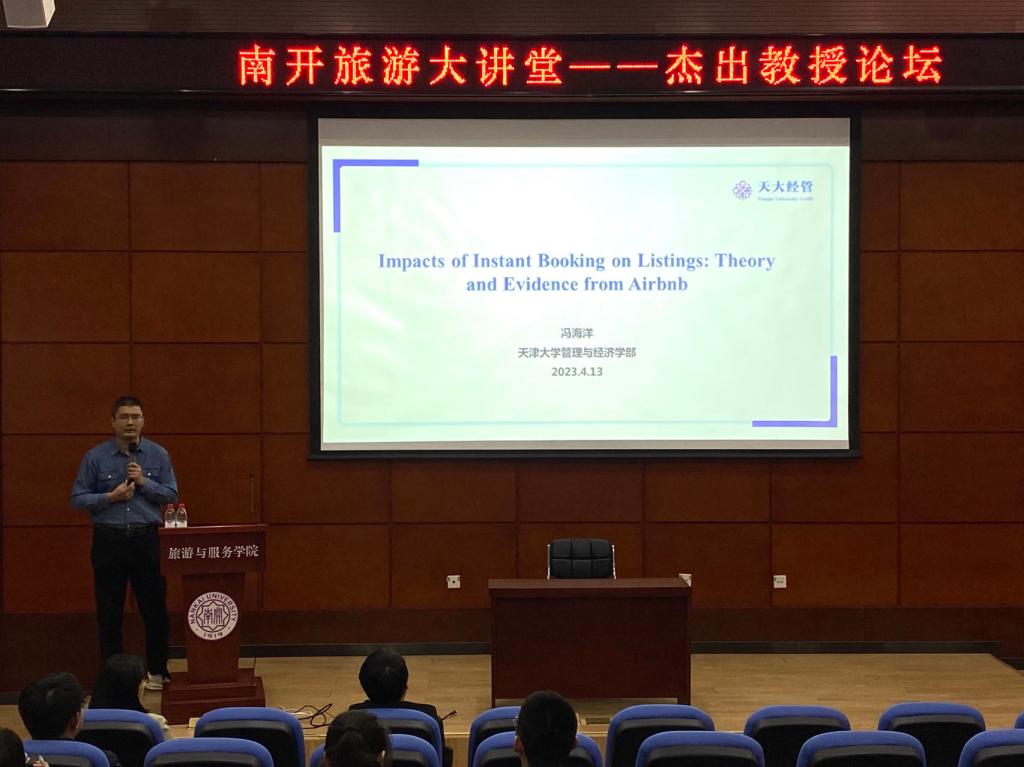 (通讯员:熊流芳)4月13日下午,“南开旅游大讲堂(第185期)——杰出教授论坛”在公司135会议室顺利举行。应公司邀请,天津大学管理与经济学部冯海洋教授为公司师生带来了“共享住宿平台即时预订模式影响分析——理论与实证研究”的精彩讲座。公司经理、教授、青年教师、博士后和硕博研究生等共计50余人参加了此次讲座,李辉教授担任此次讲座的主持人。