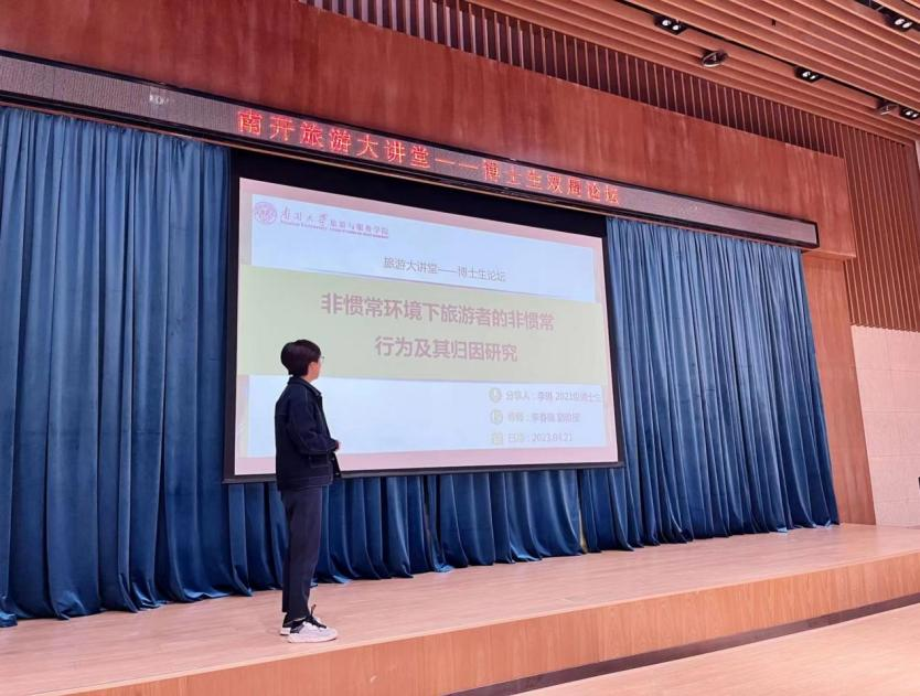 本次论坛上,李琳同学从研究缘起、概念辨析、类型界定、理论建构、理论应用五个方面展开分享。李琳同学的研究延续了导师团队关于旅游特殊性的挖掘以及旅游本质的探讨。分享内容包含一篇建构式综述和一篇质性研究。建构式综述部分基于对国内外非惯常环境、旅游者行为变化研究的辨析,提出非惯常环境和非惯常行为的内涵界定和存在类型。质性研究部分以酒店情境为例,探究了酒店中旅游者的非惯常行为表现及成因。上述研究在一定程度上拓展了对旅游者行为变化方向、程度、原因的认知。