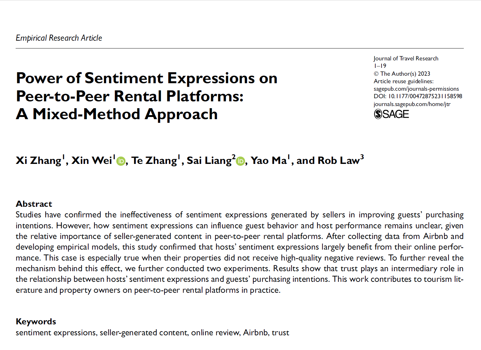 近日,公司梁赛副教授作为通讯作者与合作者完成的研究成果《Power of sentiment expressions on peer-to-peer rental platforms: A mixed-method approach》被旅游管理学科国际三大顶尖期刊之一的《Journal of Travel Research》接收并发表。