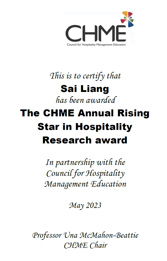 近日,2023国际酒店管理与教育委员会(Council for Hospitality Management Education,CHME)年度会议在荷兰举办,会议上授予了公司梁赛副教授 “the CHME Annual Rising Star in Hospitality Research award”(年度研究新星奖),以表彰其在酒店管理研究方面的创新和卓越贡献。这是公司教师首次获得此类奖项。