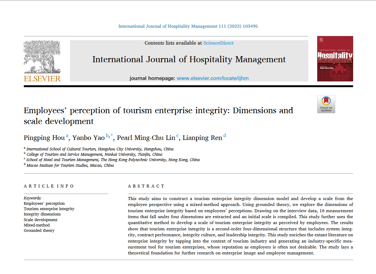 近日,姚延波教授作为通讯作者与合作者完成的研究成果《Employees’ perception of tourism enterprise integrity: Dimensions and scale development》在国际高水平期刊《International Journal of Hospitality Management》上发表。该期刊2022年影响因子为10.427,在旅游管理领域中具有权威性、学术影响力和学术声誉。