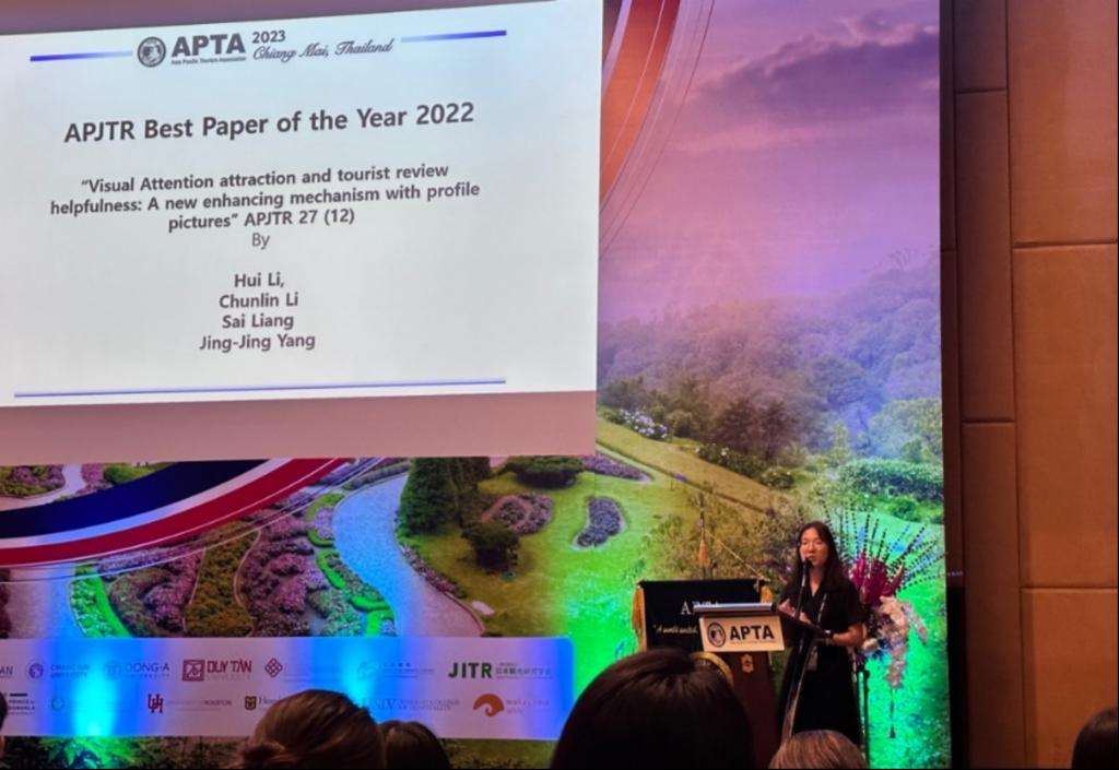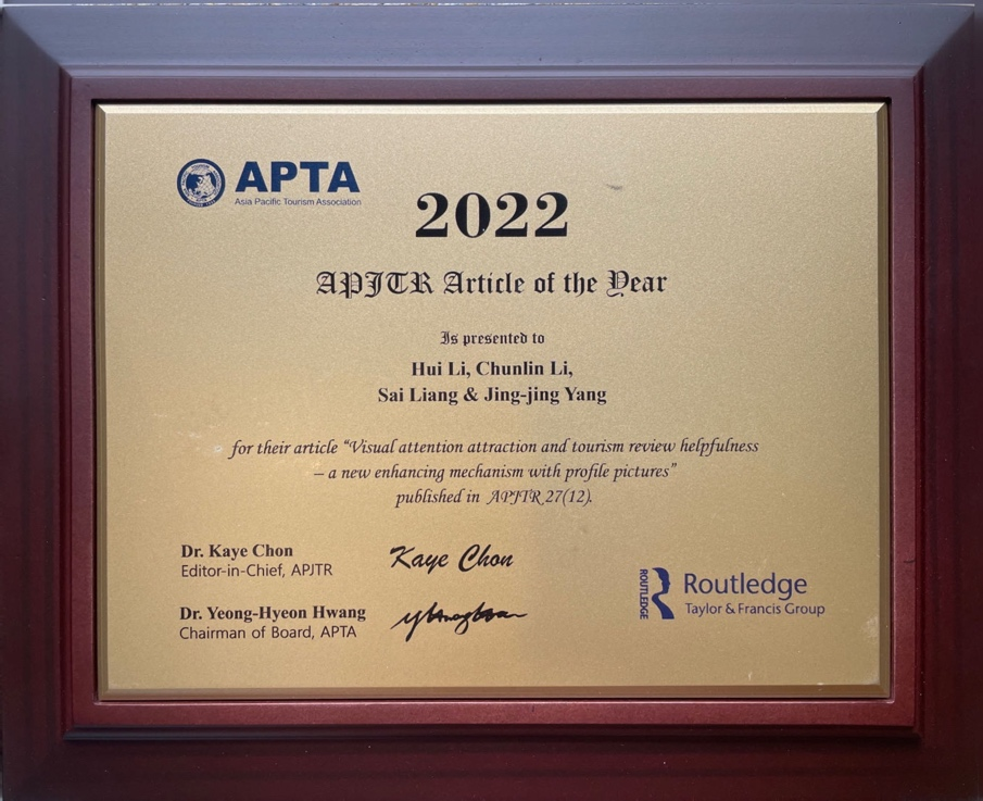 近日,亚太旅游学会(Asia Pacific Tourism Association,简称APTA)2023年度学术会议在泰国清迈举办,公司李辉教授、硕士生李春林、梁赛副教授同校外合作者共同完成的、刊发于Asia Pacific Journal of Tourism Research(APJTR)期刊上的研究成果”Visual attention attraction and tourism review helpfulness – a new enhancing mechanism with profile pictures”在会上被APTA国际学会和Routledge国际出版社联合授予APJTR期刊年度最佳论文奖。