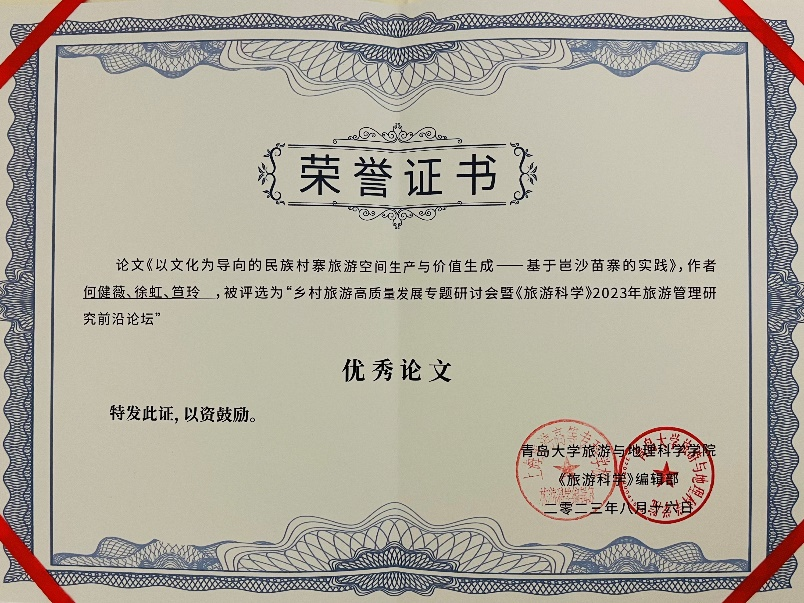 在分论坛上,徐虹教授团队成员何健薇汇报的《以文化为导向的民族村寨旅游空间生产与价值生成——基于岜沙苗寨的实践》荣获会议优秀论文。