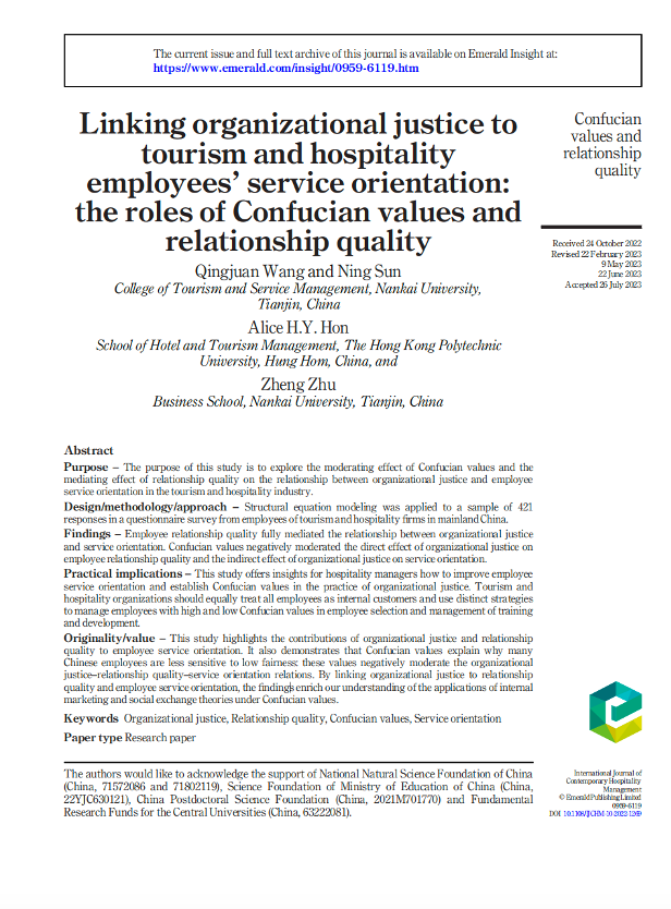 (通讯员 黄筱璐)近日,由公司王庆娟副教授、孙宁助理研究员及合作者共同完成的研究成果《Linking organizational justice to tourism and hospitality employees’ service orientation: the roles of Confucian values and relationship quality》被旅游管理科学国际五大顶尖期刊之一的《International Journal of Contemporary Hospitality Management》接受并发表。
