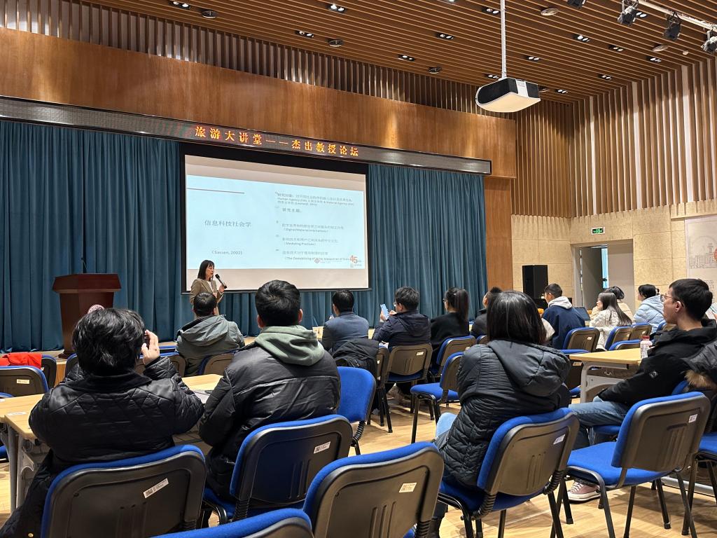 首先,王丹老师从信息科技的多维视角介绍了信息技术社会学的研究背景、研究对象和研究主题,阐释了数字网络既嵌入在硬件和软件的技术特征和标准中,也嵌入在实际的社会结构和权力动态中,在旅游和酒店研究中融合,使行业和旅行者行为发生重大转变。接着,王丹老师用自身2014年至2023年的3个启发性研究案例向同学们进行了具体介绍,包括:智能手机使用模型、日常生活和旅行中的智能手机使用、智能手机对目的地群体决策的塑造的历史沿革,阐释了智能手机在旅游消费和游客体验中的结构化作用。