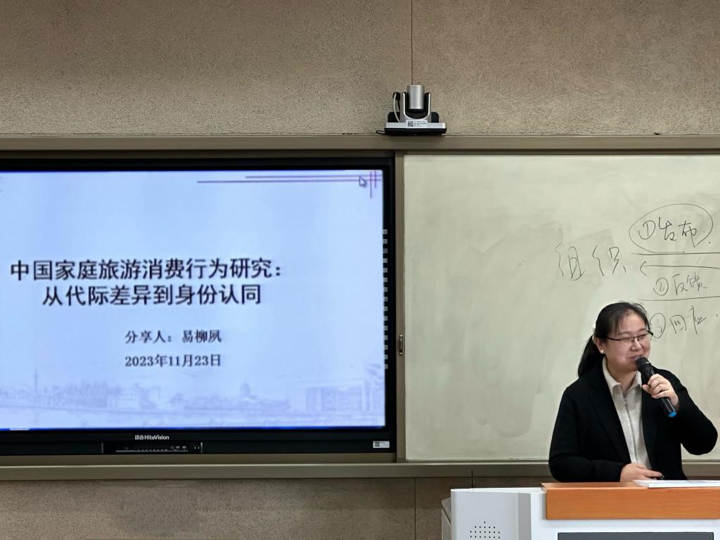 易柳夙老师以“家庭旅游消费行为研究:从代际差异到身份认同”为主题进行了报告。首先易柳夙老师介绍了旅游消费中的代际差异现象和代际影响研究现状及消费行为领域的代际影响研究动态,进行了文献研究总结。接着,易柳夙老师从研究背景、文献和理论、方法与发现、研究结论分享了该研究的实证探索。
