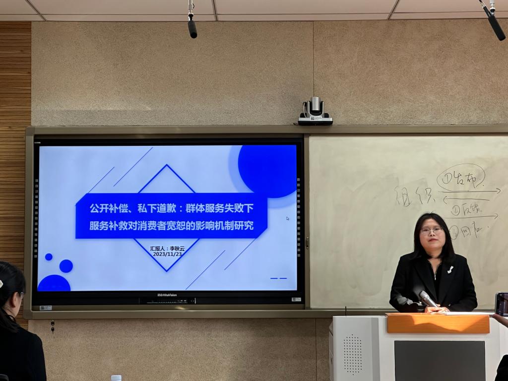 李秋云老师以“公开补偿、私下道歉:群体服务失败下服务补救对消费者宽恕的影响机制研究”为主题进行了报告。首先李秋云老师用数个案例介绍了该研究的现实背景和理论背景,提出研究问题,并介绍了消费者宽恕、服务补救类型、服务补救公开性三个研究概念,随后在三个研究假设的基础上提出理论模型并用三个实验进行实证得出结论,最后,李秋云老师也分享了该研究的理论贡献、实践启示和研究局限。